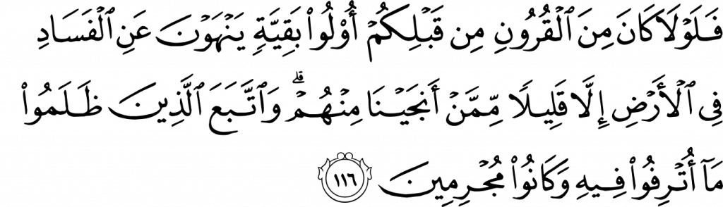 If only there had been, among the generations before your time, people with a remnant of good sense to forbid corruption on the earth! We saved only a few of them, while the unjust pursued the enjoyment of plenty and persisted in sin. (Q. Hūd, 11:116)